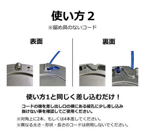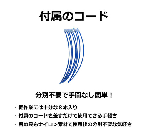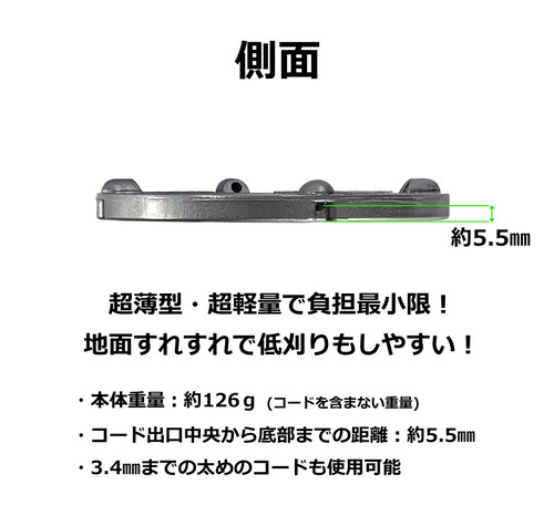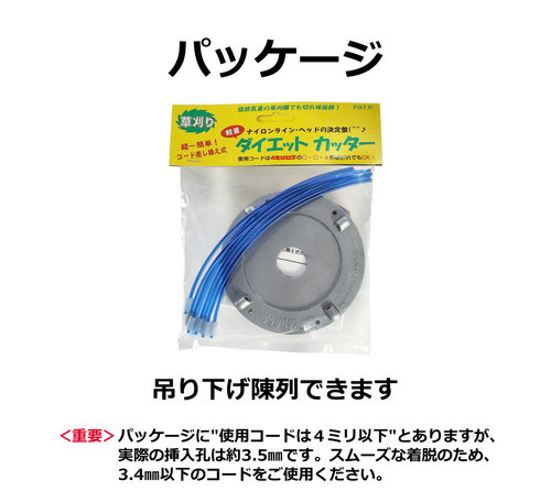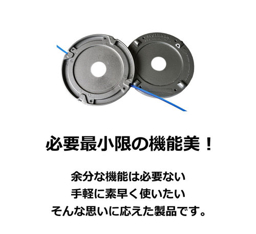 | 説明 | 【究極のシンプルさを追求。軽さと手軽さで選ぶならこの一台】 「ダイエットカッター」は、短尺のナイロンコードを差し替えるだけで使える、超シンプルな手差し式ナイロンカッターです。複雑な構造をすべて削ぎ落としたアルミ製ボディにより、シリーズ屈指の「軽さ」と「扱いやすさ」を実現しました。 <本製品の大きな特徴> ●迷わず使える「差し込み式」構造 複雑な部品や構造は一切ありません。差込口にコードを差し込むだけで準備完了。初めてナイロンカッターを使う方でも、戸惑うことなくすぐにご使用いただけます。 ●圧倒的な軽さ「約128g」 アルミ製の薄型ボディを採用することで、本体重量わずか約128gという驚異的な軽さを実現。長時間の作業でも腕や肩への負担が少なく、軽快に草刈りが行えます。 ●後片付けが楽な「オールナイロン製留め具」 付属の短尺コードは、留め具部分までナイロン素材で作られています。使用後の分別廃棄が不要(※)なため、作業後の手間が大幅に削減されます。 ※ゴミの分別については、お住まいの自治体のルールに従ってください。 ●自由度の高いコード選択 2本出し・4本出しのどちらでも使用可能。市販の留め具付きコードはもちろん、長尺コードをカットした自作コードも使用でき、経済的です。 ●こんな方におすすめです ・余計な機能は不要で、とにかくシンプルなものが良い方 ・刈払機を少しでも軽くして、作業の疲れを軽減したい方 ・手軽に、かつ素早く作業準備を済ませたい方 ・面倒なゴミの分別作業を楽にしたい方 取付は1インチ(25.4㎜)の丸穴取付式なので、ほとんどの刈払機に簡単に取付可能です。 付属のナイロンコードと同じ規格のコード「マリンブルー短尺コード50本入り(別売り)」もありますので、併せてご入手いただければ別途コードをご用意する手間が省け、手軽に長期間ご使用いただけます。 <製品の仕様> 【直径】5インチ 【重量】約128g 【適応コード径】2.0㎜~3.4㎜ 【適応エンジン】20cc~30cc 【取付穴径】1インチ(25.4㎜) 【回転方向】左回転(反時計回り)・右回転(時計回り)どちらでも使用できます。 【付属品】短尺コード8本 (丸 約3.0㎜ 約20㎝) <安全・便利にご使用いただくために> ・カッター本体を毎分10,000回転以上で使用しないでください。 ・異なる太さ・形状のコードを混ぜて使用しないでください。 ・4本出しで使用する場合は、排気量が大きい機械での使用をお勧めします。 ・別売りの「マリンブルー短尺コード(50本入り)」を併用いただくと、より手軽に長期間ご使用いただけます。 <製品の構成内容> ・ダイエットカッター本体 ・短尺コード8本 (丸 約3.0㎜ 約20㎝) ・取扱説明書 ※付属の短尺コードと同じコードは「別売りの50本入り」のみご用意があります。 詳しくはこちら <左右回転対応のバッテリー式刈払機をご使用の場合> ・初めに 電動工具メーカーより発売されたバッテリー式刈払機で、手元のスイッチにより左回転・右回転の切り替えが可能なものがあります。 作業中の環境に応じて回転方向を切替えることにより飛散方向の切替・作業の効率化が図れるというコンセプトのようです。 ※本製品は左回転・右回転どちらでも使用できます。 |